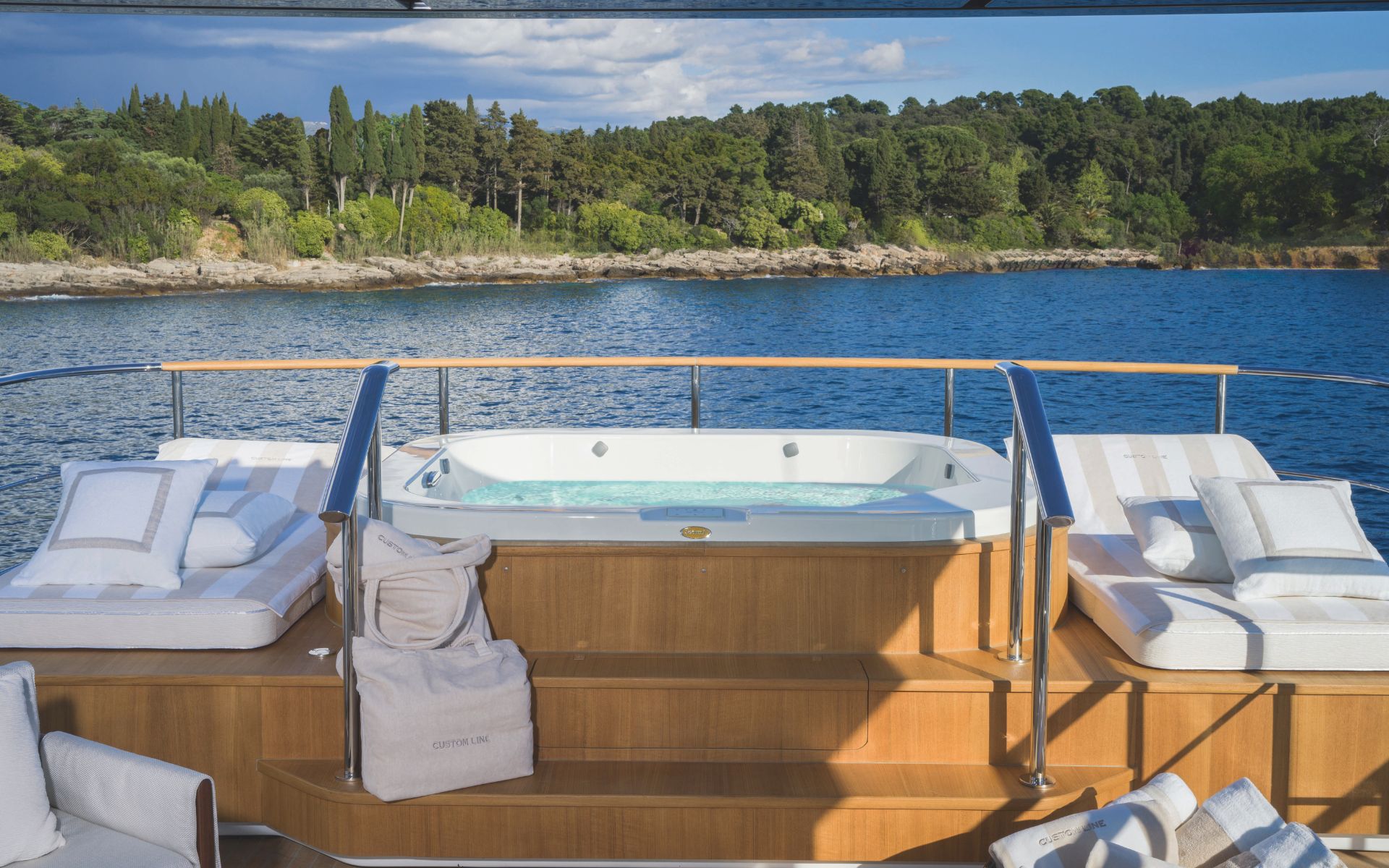 - Installation made on a Custom Line yacht with AISI 316L 'marine grade' stainless steel frame and 'Antivortex' system, according to international safety regulations.